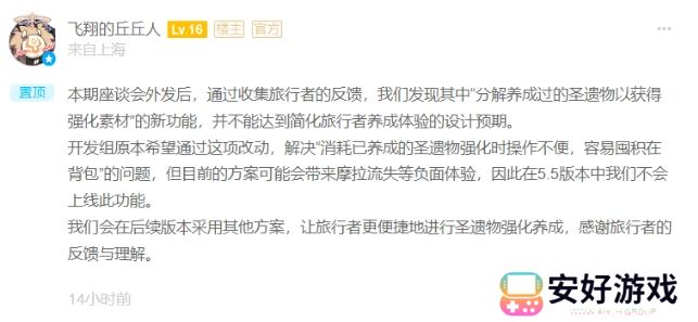 另一方面,原本计划在5.5版本中实施的圣遗物分解优化因未能达到预期效果而被暂时撤回。考虑到分解圣遗物后获得的强化素材并未如预期般简化玩家的养成路径,反而可能导致摩拉等资源的浪费,开发团队决定暂停这一改动,并将在后续版本中重新评估并推出更加完善的方案。这一决策体现了官方对玩家反馈的高度重视以及致力于提供最佳游戏体验的决心。