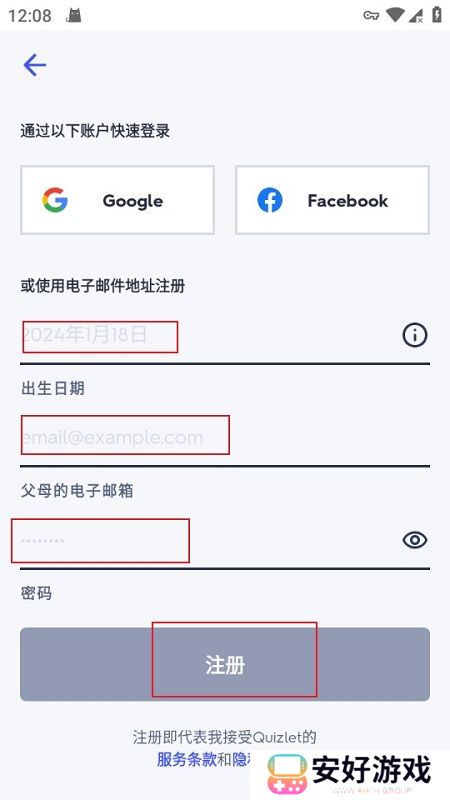 2、然后输入电子邮件地址、出生日期、父母的电子邮箱、输入密码,然后点击“注册”按钮即可!