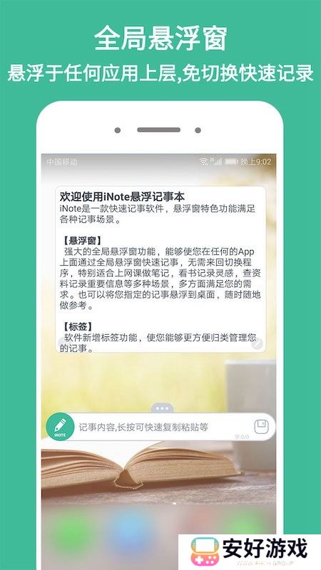 强大的全局悬浮窗功能,能够使您在任何的App上面通过全局悬浮窗快速记事,无需来回切换程序,特别适合看书做笔记,记录灵感,查资料记录重要信息等多种场景,多方面满足您的需求。