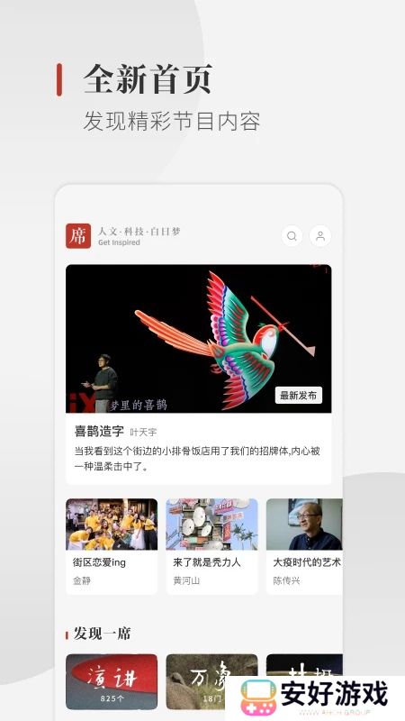 一席安卓客户端是一款文学阅读爱好者手机应用,涵盖了天罗地网的知识,你可以更自由的探索知识的海洋,你可以在这里寻找到过去10年的演讲、万象、枝桠、记录等,支持睡前聆听,智能记忆播放,欢迎下载体验吧。