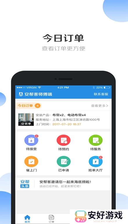 安帮客app手机版是一款专为家居、建材行业安装服务人员打造的服务软件,旨在帮助师傅们更高效地接单、管理订单、与客户沟通,提高整体服务质量,有需要的朋友快来下载吧!