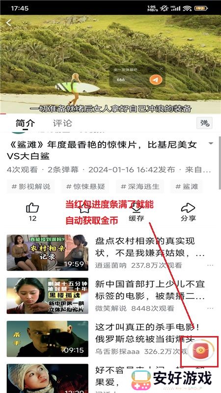 4、看视频赚现金只需点击软件首页,找到任意一个视频进行观看,当下方的红包进度条满了即可获取对应的金币,看得越多赚的金币就越多。