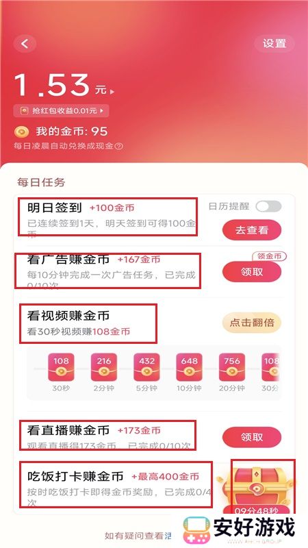 3、这里拥有各种任务,你可以完全每日签到、看广告赚金币、看视频赚金币、看直播赚金币、吃饭打卡赚金币等任务