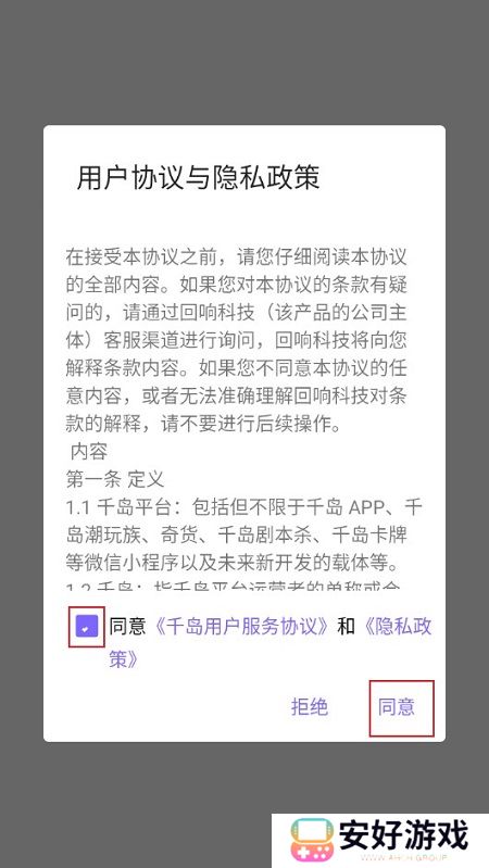 2、第一次进入软件会弹出《千岛用户服务协议》《隐私协议》,勾选上以后点击同意按钮;