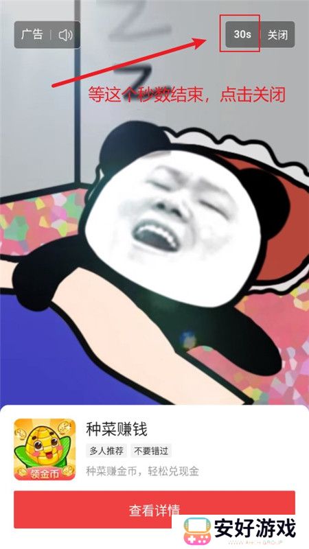 4、这时会进入一个看广告的界面,右上角会有广告的秒数,当时间结束后,点击关闭即可获取对应的金币奖励;