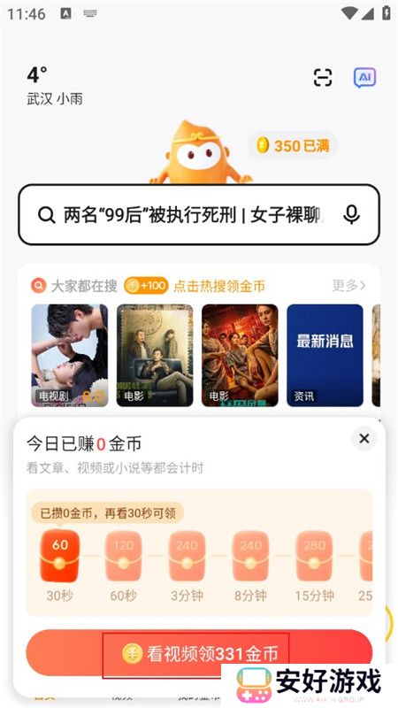 3、打开悟空浏览器后,在主页找到“金币红包”类似的图标,点击看视频领金币。