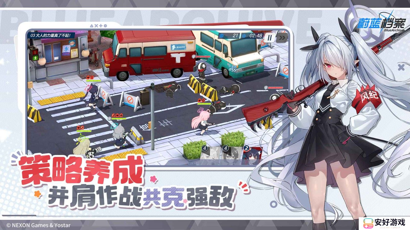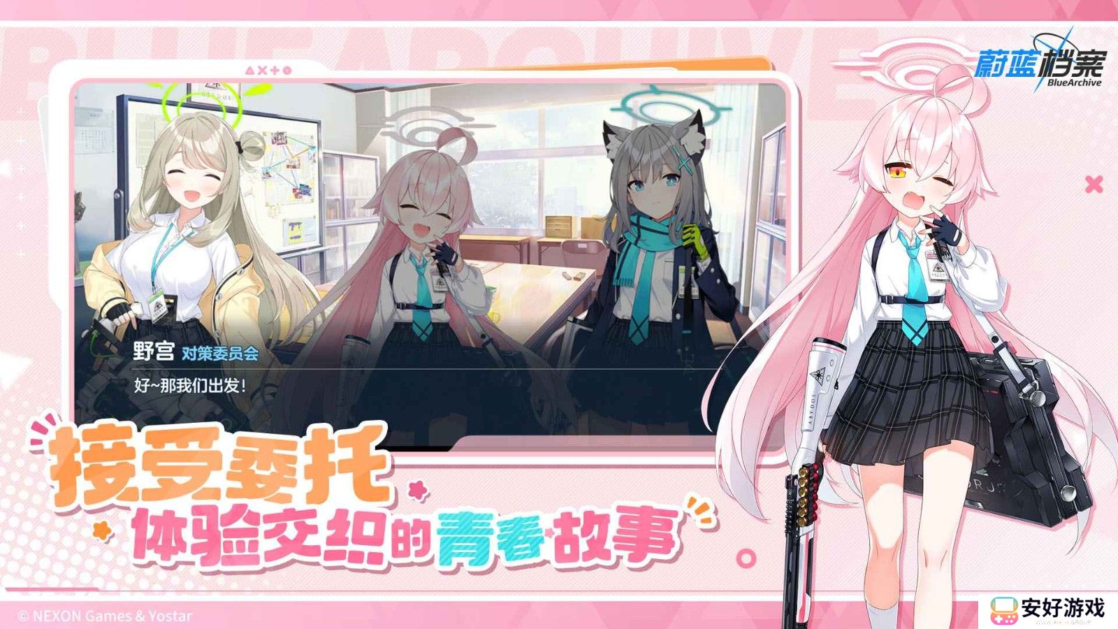 《蔚蓝档案》(又称《碧蓝档案》)是一款由韩国NEXON Games旗下的MX studio开发,上海悠星网络发行的二次元角色扮演游戏。游戏中,玩家将扮演联邦搜查社「沙勒」的指导教师,与来自基沃托斯不同社团的少女们相遇,共同解决发生在超大型联合都市「基沃托斯」的各种事件。游戏以奇幻的学院为背景,融合了策略、冒险与角色扮演元素,为玩家带来一场充满青春活力的二次元冒险之旅。