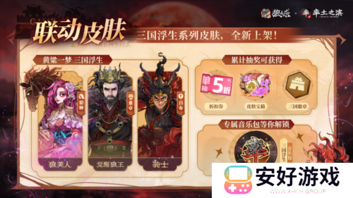 联动皮肤惊喜来袭,狼人杀经典角色梦回三国,化身三国武将,狼美人变身为貂蝉,闭月之姿暗藏致命魅惑,骑士化为吕布,手持方天画戟寒光凛冽,一骑当千守护信仰,觉醒狼王化为董卓,尽显枭雄本色,威慑全场。活动期间开启三国浮生系列皮肤宝箱即有机会获得,还有“三国浮生”音乐包等你来拿。