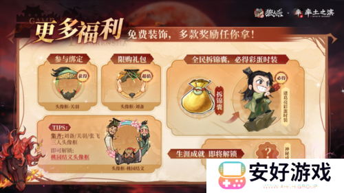 参与全民拆锦囊玩法,还将获得诸葛亮彩蛋时装,更有机会获得网易狼人杀卡牌礼盒、率土之滨礼盒等超值福利,参与互动集齐刘备、关羽、张飞三人联动头像框即可解锁桃园结义头像框,更多玩法等你来探索!